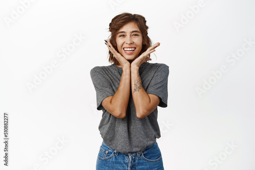 Adorable young woman with perfect facial skin without makeup, smiling white teeth, showing her face and laughing satisfied, standing over white background