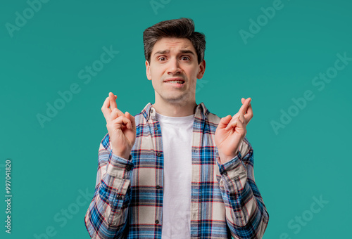 Adult 30s man praying with crossed fingers on blue background. Guy begs God help