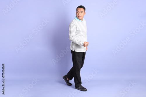 person, portrait, man, asian, 40s, male, isolated, adult, background, smart, studio, standing, casual attire, chinese, colours, blue, purple, walking, stride, step, forward