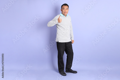 person, portrait, man, asian, 40s, male, isolated, adult, background, smart, studio, standing, casual attire, chinese, colours, blue, purple, hand, success, concept, finger, positive, agreements, communication, approval, thumb up, satisfaction, happy, smile, cheerful