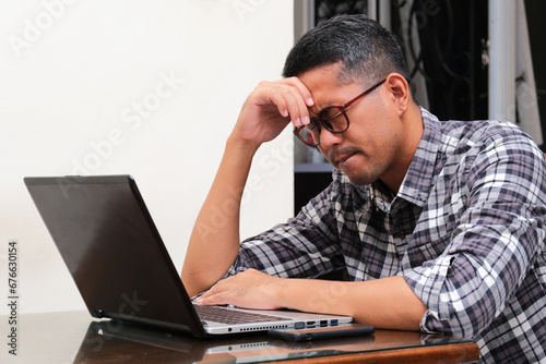 Adult Asian man sitting in front of laptop with stress expression