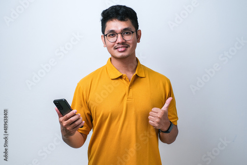 asian, man, smiling, confidence, goggles, thumb, up, holding, mobile, phone, mobile phone, smart, guy, give, expression, face, happy, isolated, white, background, indonesian, model, hand, person, wearing, shirt, male, looking, camera, gesture, people, studio, agree, approve, check, concept, done, friendly, good, photogenic, isolated on white, mobile phone, signs, right, portrait, ok, successful, thumb up, advertisement