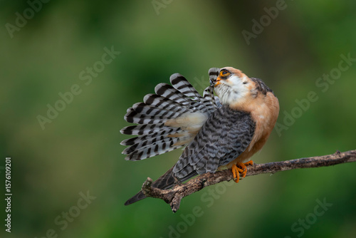 adult female red-footed falcon (Falco vespertinus) preening its tail feathers while perching on a branch, found in Hortobagy National Park