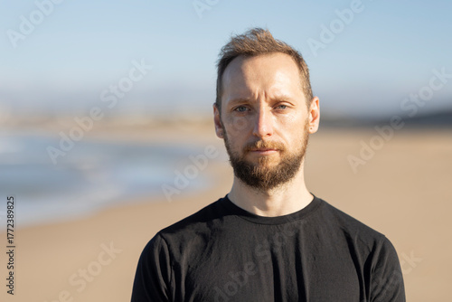 man, adult, male, beach, beard, serious, portrait, outdoors, real people, caucasian, natural light, summer, sand, ocean, sea, person, head shot, identity, individual, calm, travel, vacation, one person, daytime, confident, lifestyle