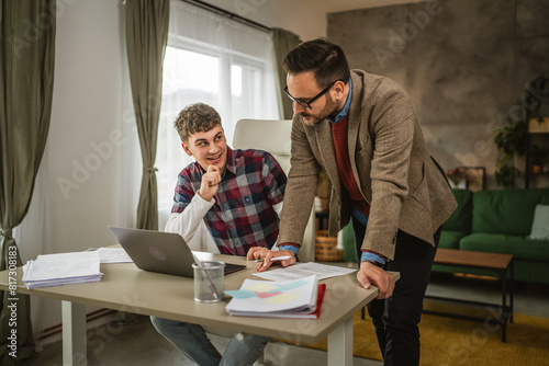 prof, student, man, young, show, adult, laptop, book, exam, mentor, study, tutor, education, motivation, help, 2, explain, touch, use, two people, racked, to sit, caucasian, copy space, home, living room, interior, smile, positive, confident, successful, read, learn, consultation, helping, cyberspace, online, people, exam, studying, pen, assignment, teaching, homework, discussing, together, note, table, lesson