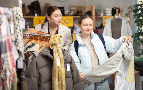 Adult woman and teenage girl choosing warm down jacket in clothing store