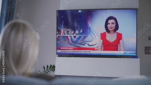 Adult woman rests on couch in cozy living room and watches TV news about national election day in USA. Elections in United States of America. TV live broadcast. Civic duty and patriotism. Back view.