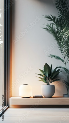 Advanced AI-powered smart home technology in modern interiors, seamless AI-powered smart home experience for everyday convenience. A modern interior featuring a plant and soft lighting for relaxation.
