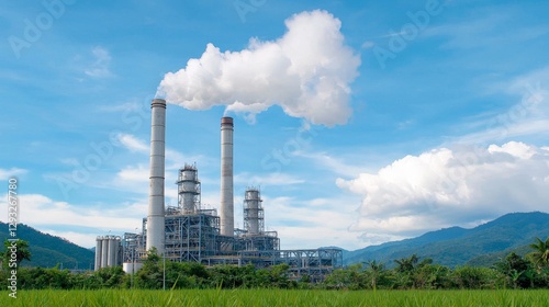 Advanced Biofuel Refinery and High-Tech Fuel Innovation, A power plant emits steam under a blue sky, surrounded by lush greenery and mountains.