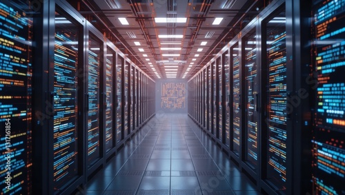 Advanced Data Center with High-Tech Servers and Illuminated Network Connections in Dark Environment