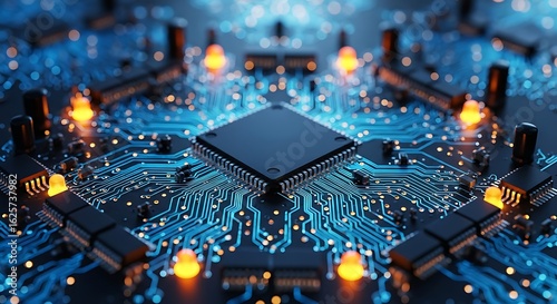 Advanced Microchip Technology with Glowing Connections Represents Modern Computing and Data Processing in a Complex System