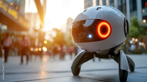 Advanced security monitoring robot in urban setting high-tech surveillance contemporary environment ground level view futuristic concept