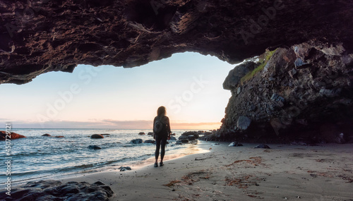 Adventurous Woman at Mystic Beach on the West Coast of Pacific Ocean. Summer Sunny Sunset. Canadian Nature Landscape Background. Located near Victoria, Vancouver Island, British Columbia, Canada.