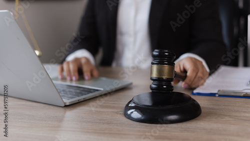 Advice and Legal services Concept. Judge gavel with Justice lawyers, Businesswoman in suit or lawyer working with laptop at desk.