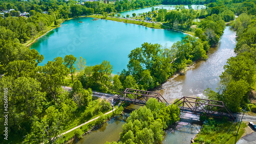 Aerial beautiful teal blue pond with summertime trees and a river running under a train bridge