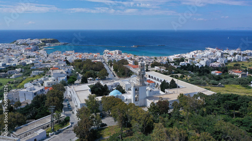 Aerial drone panoramic photo of iconic orthodox church of Lady of Tinos island or Church of Panagia Megalochari (Virgin Mary), Cyclades, Greece