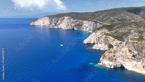 Aerial drone photo of white beach consisting of volcanic caves and white steep hill near famous shipwreck cove a wonder of nature, Zakinthos island, Ionian, Greece