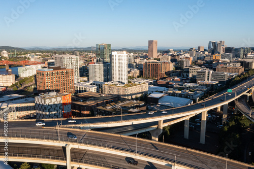 Aerial drone picture of Downtown Portland at sunset, Pearl District, industrial area, residential and office buildings, with clear blue summer sky
