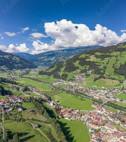 Aerial drone shot of Zillertal valley with clouds in Tyrol Austria summer