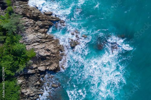 Aerial drone top view of ocean's beautiful waves crashing on the rocky island coast