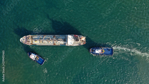 Aerial drone top view photo of industrial LPG gas and fuel container tanker docked in Mediterranean port