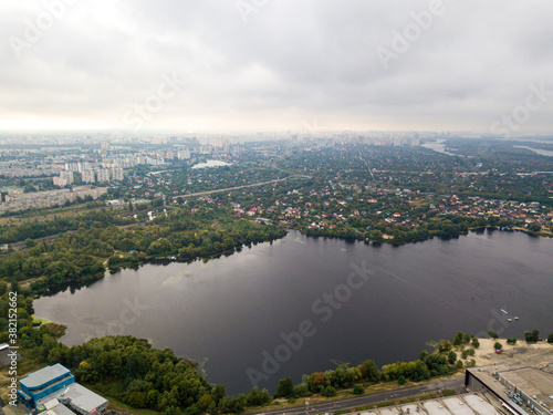 Aerial drone view. Bay of the Dnieper River in Kiev.