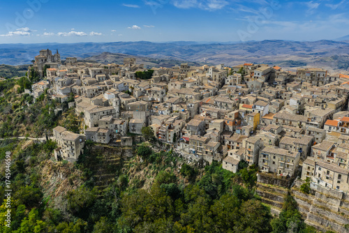 Aerial drone view of Petralia Soprana, a historic Sicilian mountain town with panoramic views of the Madonie Mountains,Petralia Soprana famous Church of Saint Mary of Loreto, Sicily, Italy