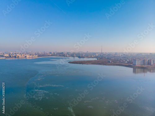 Aerial landscape photo of Morii Lake , Bucharest, Romania with many buildings in the distance.