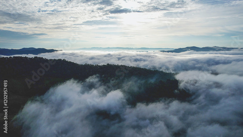 cloud, fog, sky, mountain, hill, nature, landscape, aerial, background, up high, asia, beautiful, beauty, cloud, cold, countryside, drone, environment, flowing, foggy, forest, fresh, green, high, jungle, mist, morning, national, natural, park, rainforest, scenery, scenic, season, spring, sunrise, siam, travel, tree, tropics, tropical, vale, view, wild, winter, wood