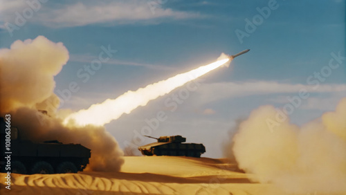Aerial Military Strike in Desert, Missile, Explosion, Armored Vehicles, Blue Sky & Orange Glow, Tension & Scale