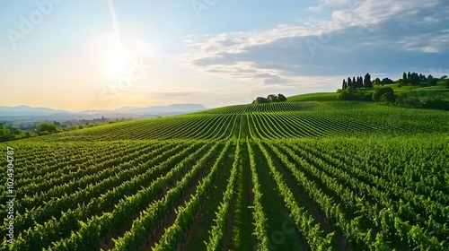 Aerial panoramic view of a lush green vineyard nestled in a picturesque countryside basking in the warm glow of the summer sun The undulating rows of vines create a serene and tranquil landscape