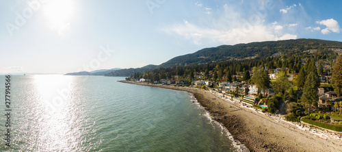 Aerial Panoramic View of a rocky beach in the modern city during a vibrant sunny day. Taken in West Vancouver, British Columbia, Canada.