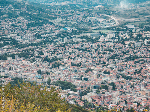 Aerial panoramic view of Sarajevo city with dense residential buildings. Urban landscape and travel destination in Bosnia and Herzegovina.