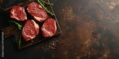 Aerial perspective of contemporary dry-aged ribeye steaks displayed on a wooden board, offering room for text.