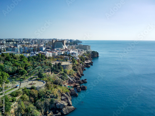 Aerial photograph of Antalya bay in Antalya city from high point of drone fly on sunny day in in Turkey. Amazing aerial cityscape view from birds fly altitude on beautiful town and sea full of yahts
