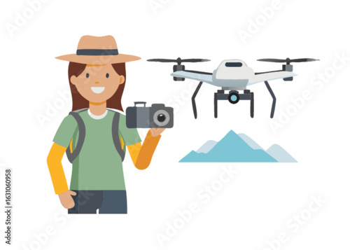 drone, camera, mountain, woman, hat, backpack, adventure, travel, photo, aerial, landscape, outdoors, photographer, nature, exploration, tour tourism, remote, technology, flying, vacation, hobby, leisure, scenic, view, peak, sky, trip, journey, gear, equipment, capture, image, picture, sightseeing, recreation, destination, flight, propeller, altitude, control, remote control, air, with