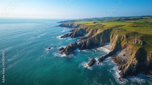 Aerial shot of rugged coastline with turquoise water and grassy cliffs. Ideal for travel brochures, nature-themed sites, or coastal promotions.