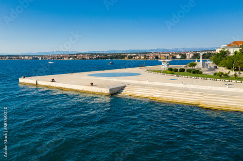 Aerial shot of Zadar old town, famous tourist attraction in Croatia. Waterfront aerial summer view, Dalmatia region of Croatia. Drone.