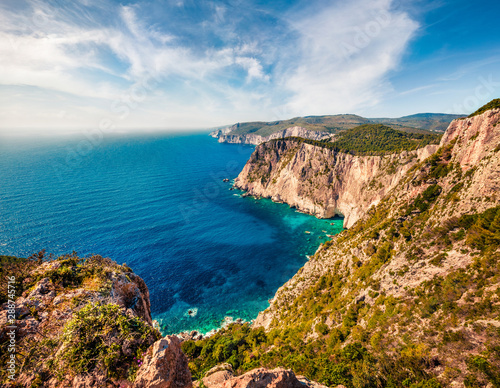 Aerial spring view of high cliffs on the Ionian Sea. Sunny morning seascape of Zakynthos (Zante) island, Greece, Europe. Beauty of nature concept background.