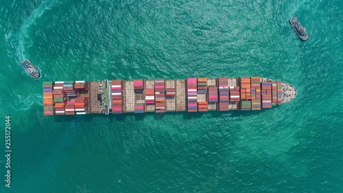 Aerial top view container ship and tug boat on the sea at sea port or container warehouse. Logistics, import export, shipping or transportation concept.