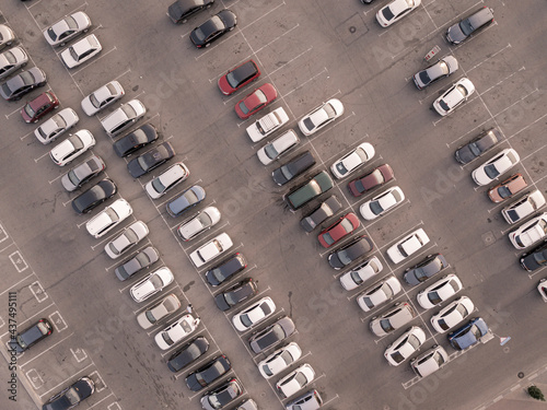 Aerial top view from drone of parking lot of the business center, shopping mall, supermarket or hospital with cars and empty parking spots at day. Transport. City. Urban.