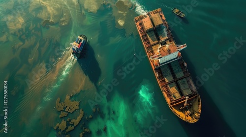 aerial, towboat, container, ship, turquoise, water, reflections, terminal, port, assisting, anchored, view, light, shipping, maritime, transport, cargo, vessel, blue, ocean, industry, logistic, waterway, nautical, coastline, harbor, freight, seaport, marin, boat, assistance, dock, movement, working, transportation, service, oceanic, journey, scene, landscape, eco, environment, travel, tranquil, commerce, infrastructure, operation, seascape