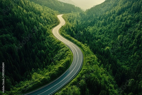 Aerial view asphalt road on green forest, Curve asphalt road on mountain green forest, Countryside road passing green forrest and mountain , ai
