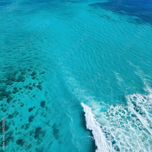 Aerial view beautiful of sea waves from drone. Stock image of blue color of ocean water, sea surface, sunset. Top view on turquoise waves, clear water surface texture.