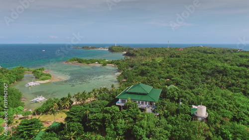 Aerial view capturing a tropical resort with a green roof nestled in lush vegetation, overlooking the turquoise waters and coral reefs of Malapascua Island, Philippines