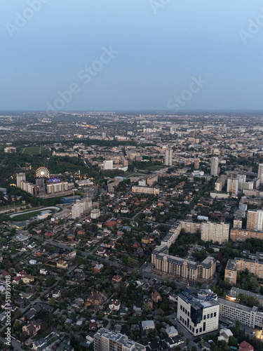 Aerial view Kharkiv city center residential area near Central park. Pavlove Pole and Center area with small and multistory high buildings in evening with street lights illumination. Vertical