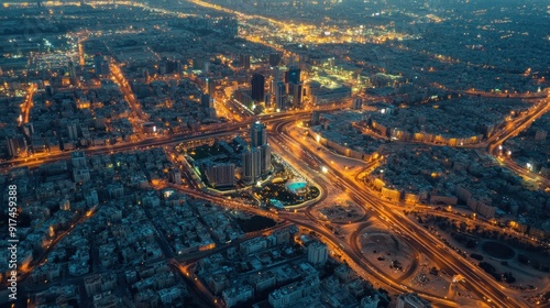 city, night, aerial, view, city landscape, highway, road, intersection, light, building, skyscraper, urban, traffic, car, dusk, street, landscape, horizon, tower, concrete, infrastructure, illuminated, metropolis, urbanism, transportation, development, modern, growth, skyline, glow, steel, glasses, tied-up, travel, architecture, design, perspective, energy, movement
