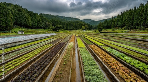 agriculture, field, cultivation, crop, vegetable, garden, farm, landscape, nature, growth, environment, green, brown, yellow, row, texture, pattern, aerial, overhead, view, plant, earth, dirtied, day, outdoors, summer, harvest, produce, fresh, organic, healthy, food, background, farming, rural, cultivate, cultivated, sunlight, horizon, sky, cloudy, diverse, composition, natural, ecological, template, space, seasonal