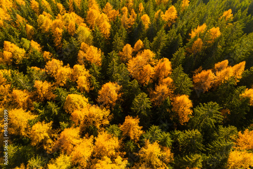 Aerial view of a forest with green and yellow larches in autumn. Rabbi valley,Stelvio National Park,Trentino,Italy