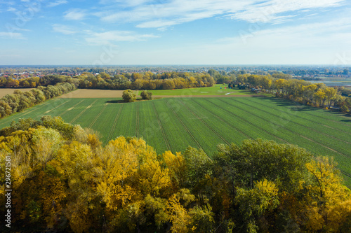 Aerial view of a green agricultural field surrounded by yellow trees. Background image of lush grass field under blue sky.